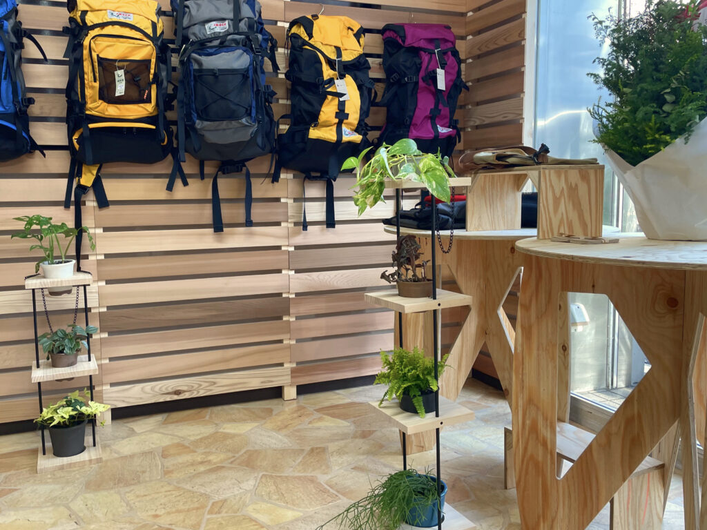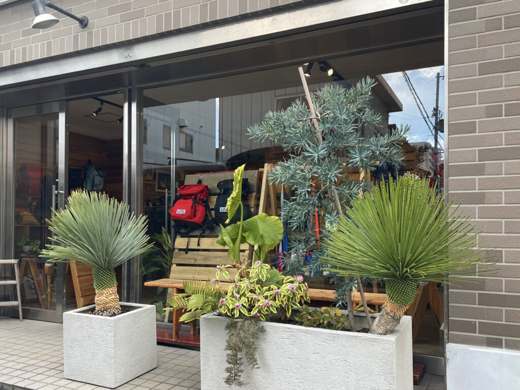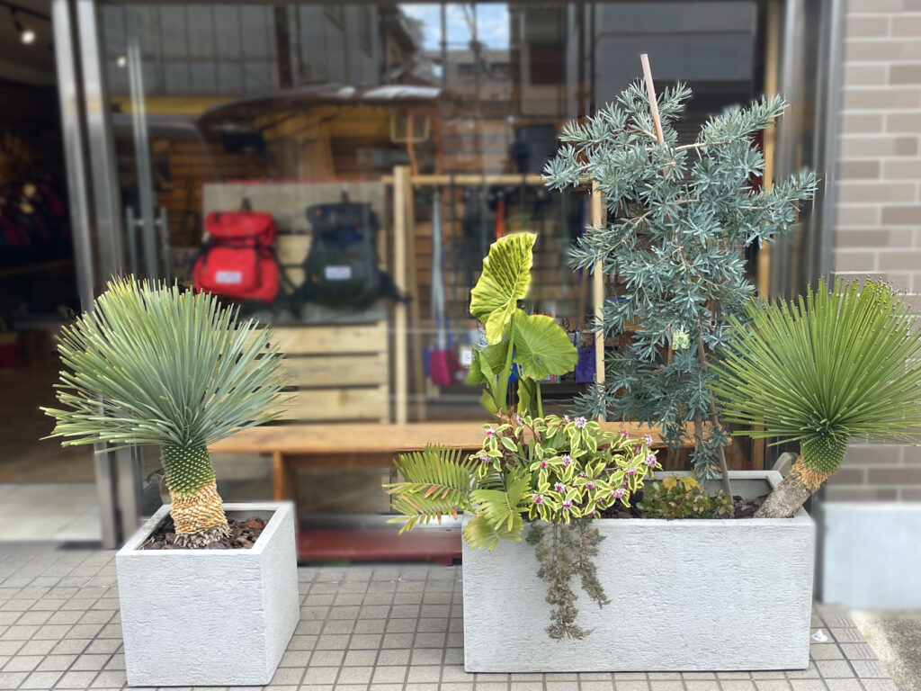 店頭の植栽。登山、ハイキング用バッグのお店のイメージに合わせ、人気のロストラータや珍しいブルーマキを寄せ植えしています。 |