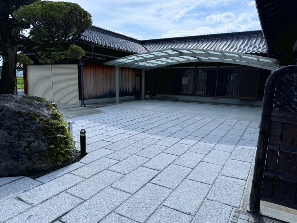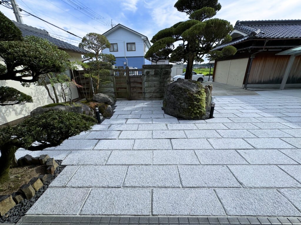 残したお庭が映えるよう、コンクリート仕上げではなく御影石の板石を全面に。