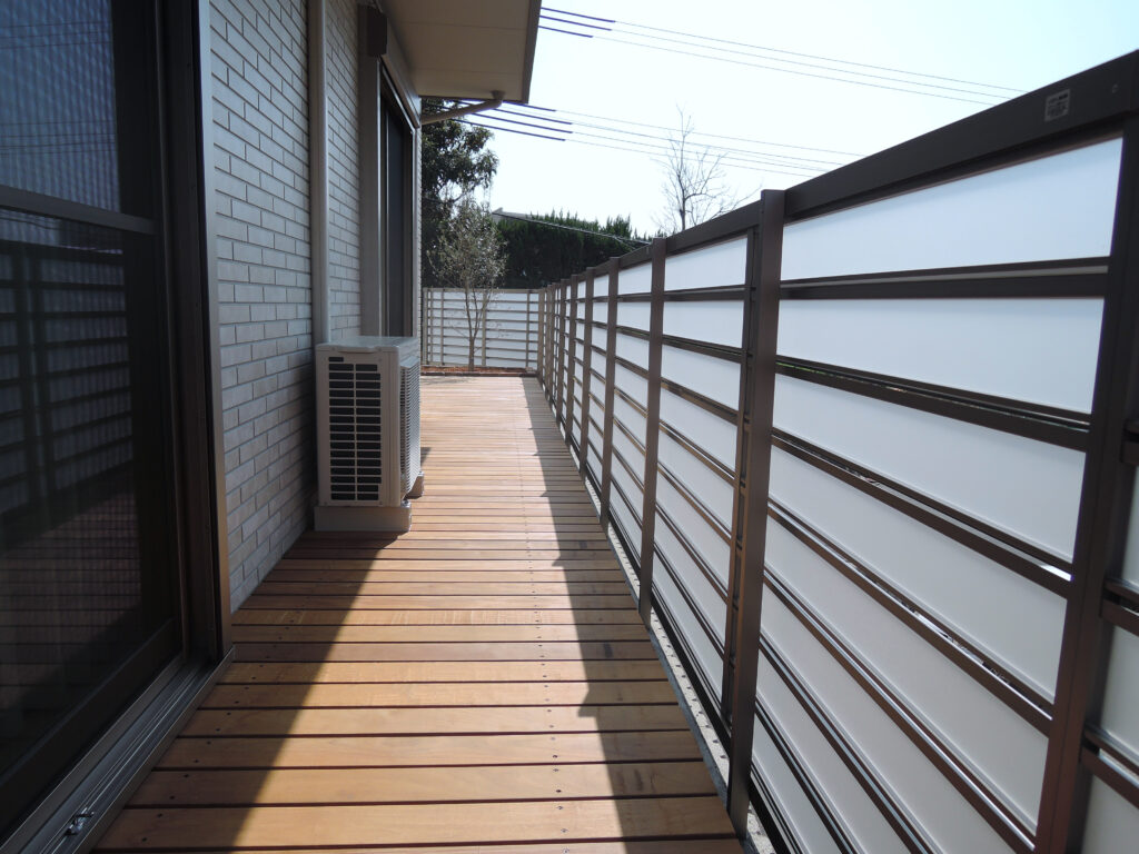 日当たりの良いウッドデッキスペースはフェンスを半透明の物を選択。目隠しもしつつ日差しも取り入れられます。