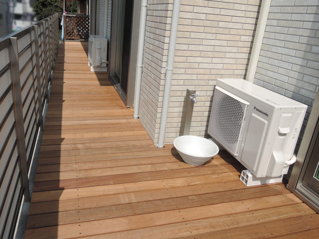 ウッドデッキにすることで、お部屋の広さを感じさせます。こちらのウッドデッキにはイペ材を使用。 |