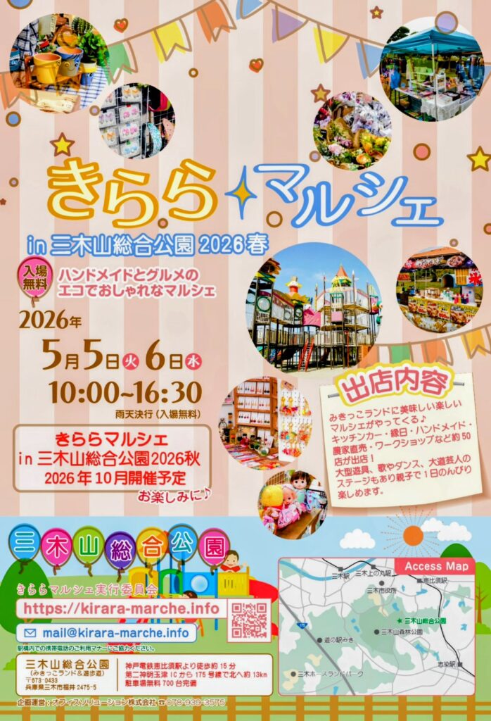 きららマルシェin三木山総合公園2026春 に出店いたします。